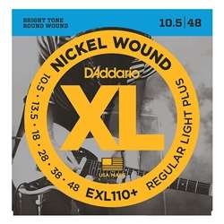 EXL110+, with its 10.5 gauge high E, is the ideal "step up" string set for players who are moving up from 10 to 11 gauge sets. Additionally, it's great for balancing tension between various scale length guitars. If you play 10s on a 25 1/2" scale guitar, try EXL110+ for your shorter scale length instruments to maintain more consistent feel and playability. XL Nickel Wound, D'Addario's most popular electric guitar strings, are precision wound with nickelplated steel onto a carefully drawn, hexagonally shaped, high carbon steel core. The result, strings with long lasting, distinctive bright tone and excellent intonation, is ideal for the widest variety of guitars and musical styles.