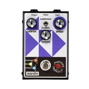 The Maestro Mariner Tremolo offers two amp-like tremolo options for “two pedals in one” functionality and increased sonic versatility. In Classic mode, you can swing from subtle, smooth amplitude modulation all the way to a sharper-edged, biting modulation, with many creative areas to explore in-between. In Harmonic mode, you can dial up timeless textural Harmonic Tremolo tones that are very reminiscent of the tones produced by a select few vintage amplifier tremolos. With its amp-like tones and ability to vary the tremolo’s wave shape, the Mariner Tremolo delivers a wide range of inspiring possibilities. The intuitive 3-knob control layout lets users quickly set the desired Depth (the intensity of the tremolo effect), control the Shape of the waveform (from a triangle wave to a square wave), and adjust the Speed of the tremolo effect. The true bypass footswitch triggers the LED lights in the bugles in the Maestro logo when it’s on, so you’ll always know when the effect is active.