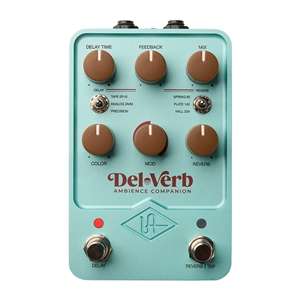 The UAFX Del-Verb is a Stereo guitar pedal with six authentic vintage reverb and delay effects, tap tempo, downloadable custom voicings, and more via the UAFX Control app. Built upon award-winning UAFX dual-engine processing and stunning sonic authenticity, Del-Verb Ambience Companion packs ready-to-wear emulations of classic reverb and delay effects, in a pedal designed for immediate inspiration.