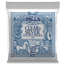 Ernie Ball 2403 Ernesto Palla concert quality classical guitar strings are made of a solid nylon filament. It is similar to, but not the same as, the nylon used for fishing line. Silver fourth, fifth, and sixth wound strings are made of silver plated copper wrapped around a nylon floss core.