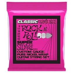 Ernie Ball 2253 Super Slinky electric guitar strings are made from pure nickel wire wrapped around tin-plated hex-shaped steel core wire. Produces a warm rich tone. Gauges 9-11-16-24-32-42