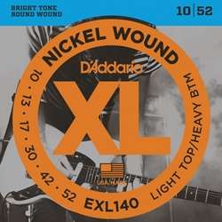 EXL140 is one of D'Addario's most popular hybrid sets, combining the high strings from an EXL110 (.010) with heavier low strings (.052). This combination delivers powerful low end for heavy chording and flexible plain steel strings for bending. Optimized for down or drop tuning! XL Nickel Wound, D'Addario's most popular electric guitar strings, are precision wound with nickelplated steel onto a carefully drawn, hexagonally shaped, high carbon steel core. The result, strings with long lasting, distinctive bright tone and excellent intonation, is ideal for the widest variety of guitars and musical styles. Gauges: Plain Steel .010, .013 .017, Nickel Wound .030, .042, .052