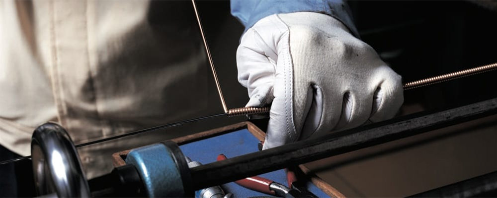 Yamaha artisans oversee the winding of pure copper and adjust the balance and tension of each bass string to the exacting standards and sound profile of every Gallery Collection piano.