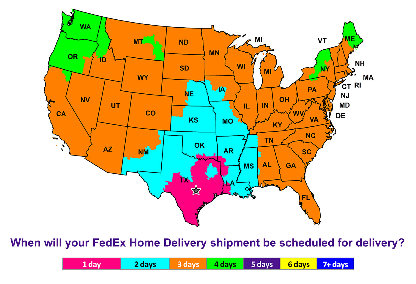 Orders typically ship within 1-2 business days for in-stock items. Most shipments can take 1-5 business days based on your order location. The following map is provided as a general guideline for FedEx Ground Economy shipments from our south Austin location.